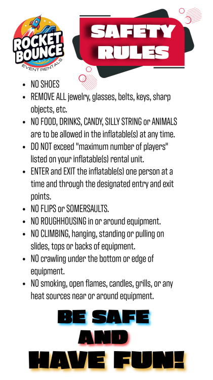 - WHAT YOU WILL NEED: Electric Outlet within 100ft of setup area, Water source if renting a water slide.